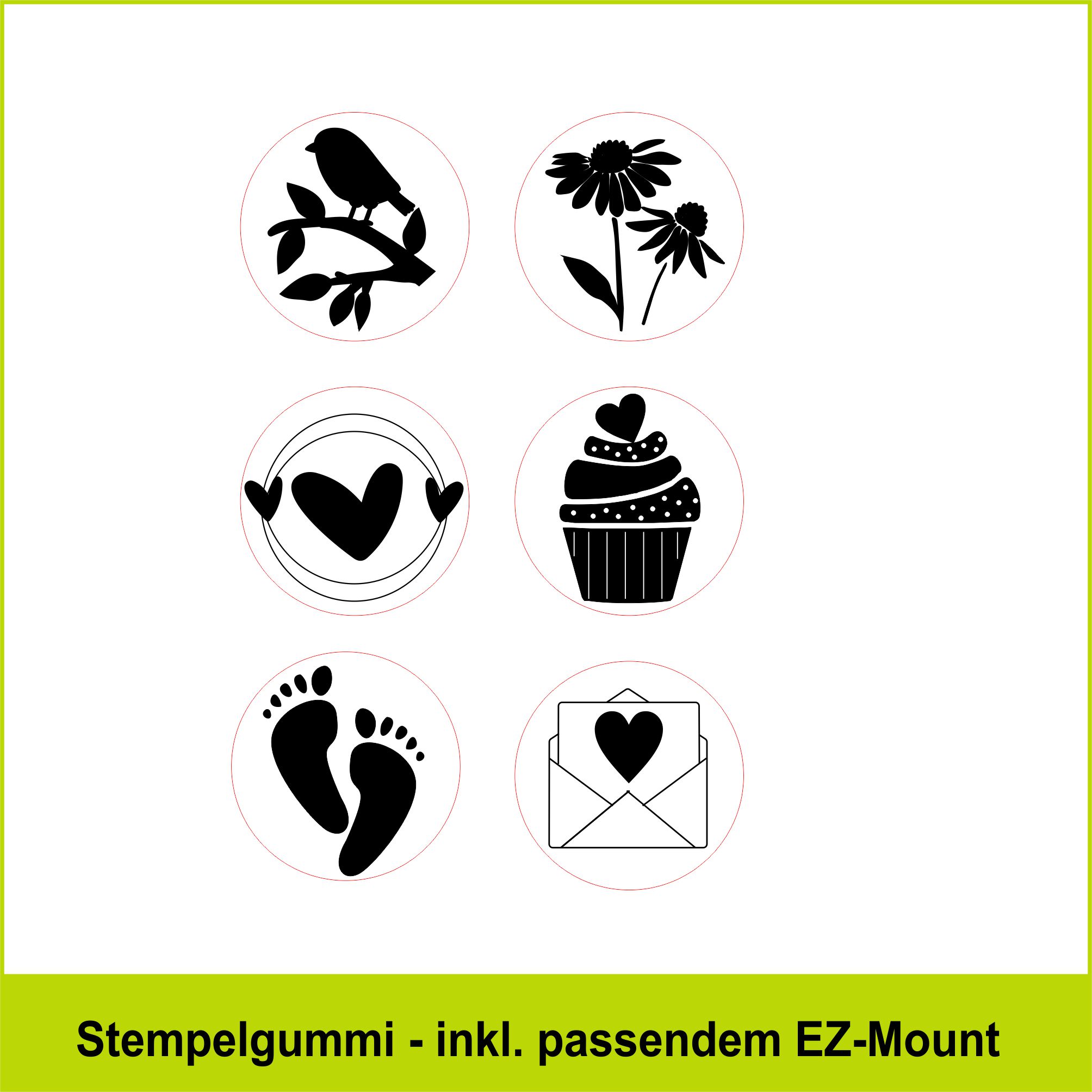 Unsere Motivstempel und Textstempel bekommst du als unmontiertes Stempelgummi geliefert, incl. des passend zugeschnittenen EZ-Mount.
