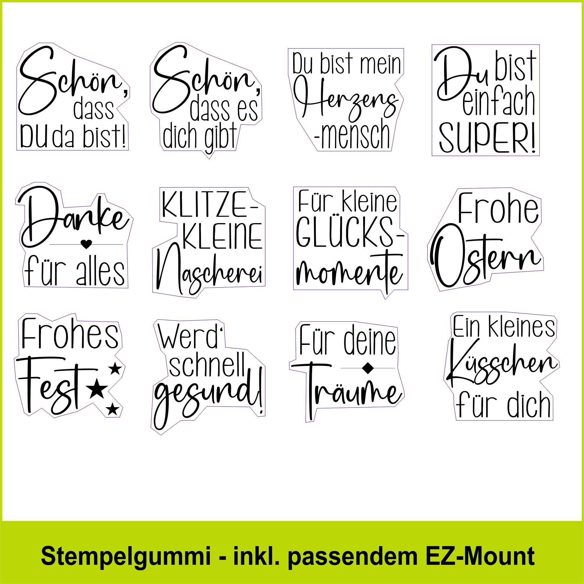 Unsere Motivstempel und Textstempel bekommst du als unmontiertes Stempelgummi geliefert, incl. des passend zugeschnittenen EZ-Mount.
