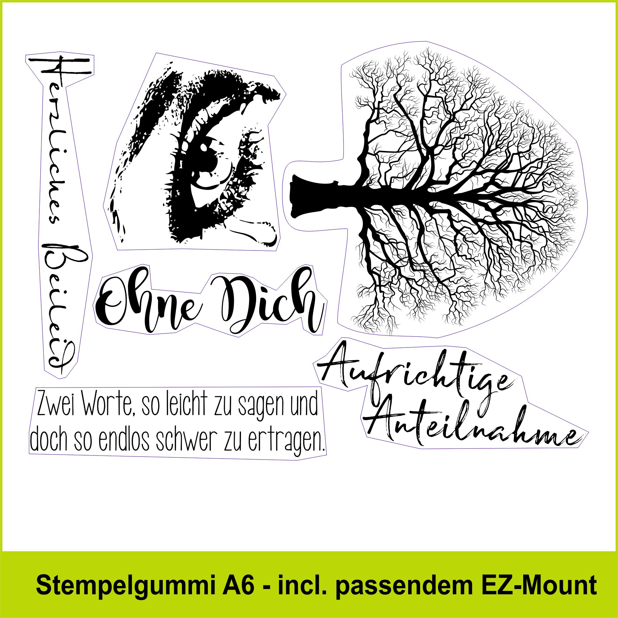 Größe: Baum 70*72mm - Auge 47*43mm - Herzliches Beileid 77*16mm - Ohne Dich 55*17mm - Aufrichtige Anteilnahme 65*26mm - Zwei Worte, so leicht zu sagen... 70*17mm