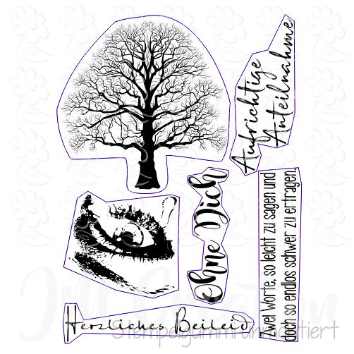 Größe der Stempelplatte: 100 x 135mmGröße: Baum 70*72mm - Auge 47*43mm - Herzliches Beileid 77*16mm - Ohne Dich 55*17mm - Aufrichtige Anteilnahme 65*26mm - Zwei Worte, so leicht zu sagen... 70*17mm