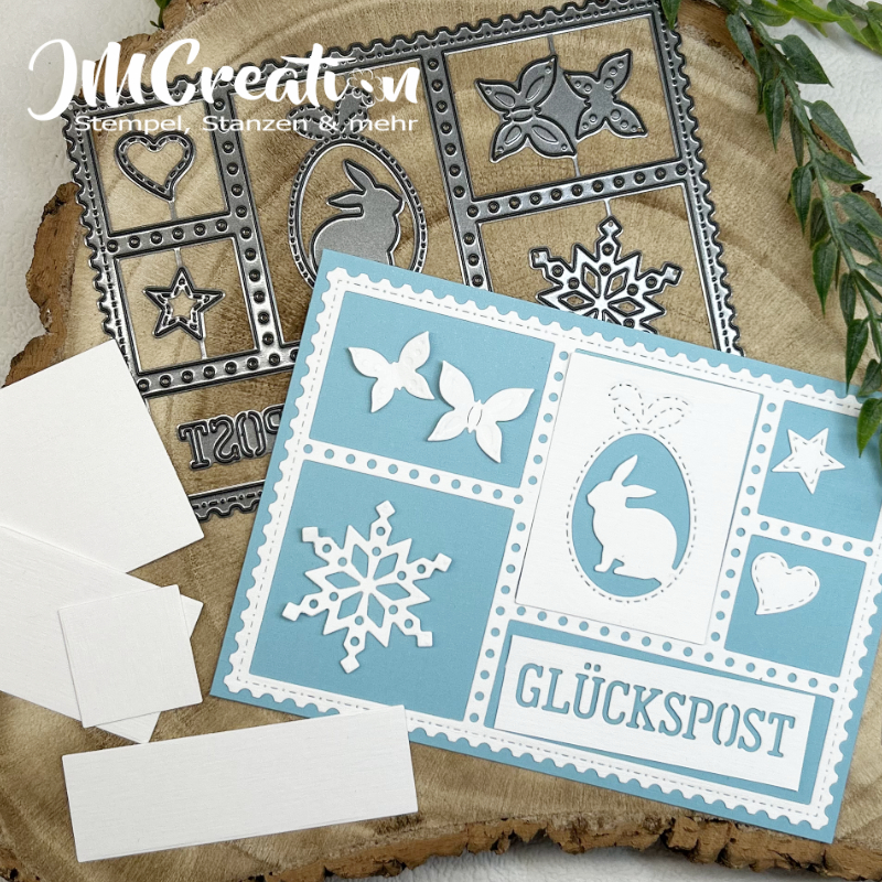 Größe: Aufleger A6 143x100mm - Ausschnitte: 27x28mm - 78x25mm - 50x50mm - 50x35mm - 45x60mm - Schmetterlinge 16x20mm + 19x23mm - Schneeflocke 40x40mm - Glückspost 65x13mm - Stern 17x17mm - Herz 17x16mm - Osterhase im Ei 29x50mm