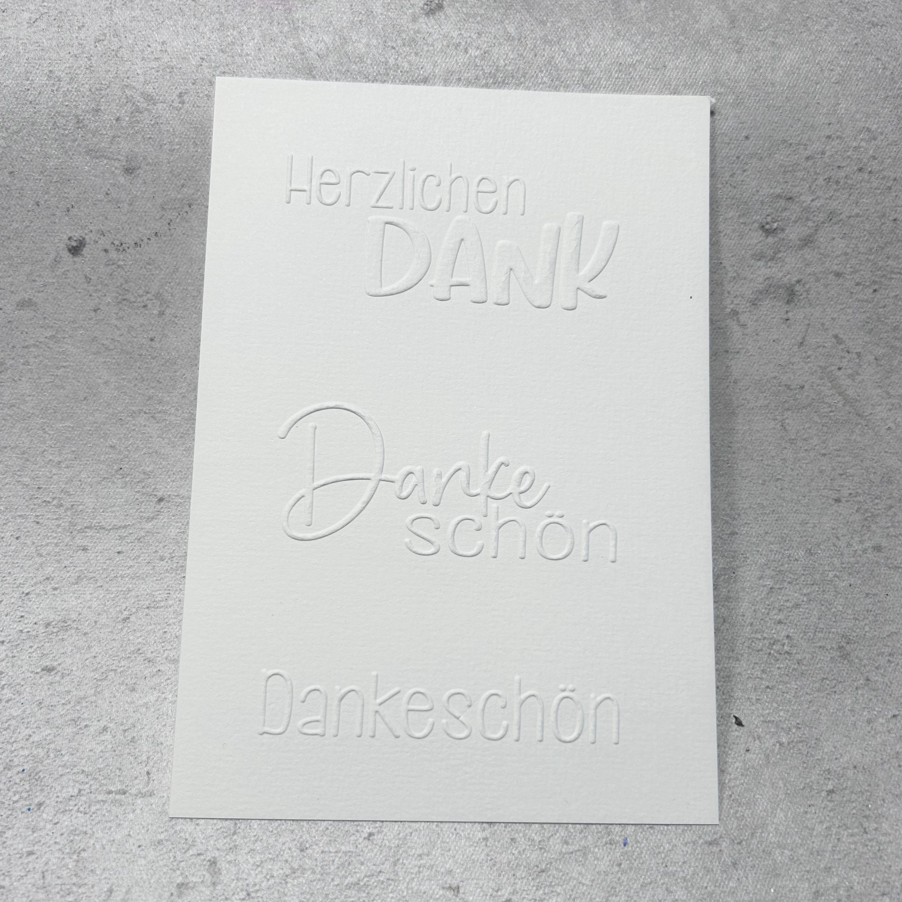 Unsere Prägefolder sind in drei Teile unterteilt. Damit die Schriften gepägt werden können, bitte erst das Papier zuschneiden und dann parziell auf den entsprechenden Schriftzug legen.